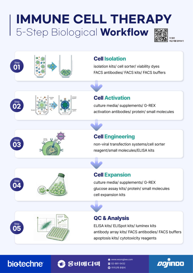 웅비메디텍이 글로벌 생명공학 선도 기업 bio-techne와 Dojindo 제품군을 바탕으로, 면역세포치료제 연구를 위한 5단계 생물학적 워크플로우 (5-step biological workflow)를 제안합니다.