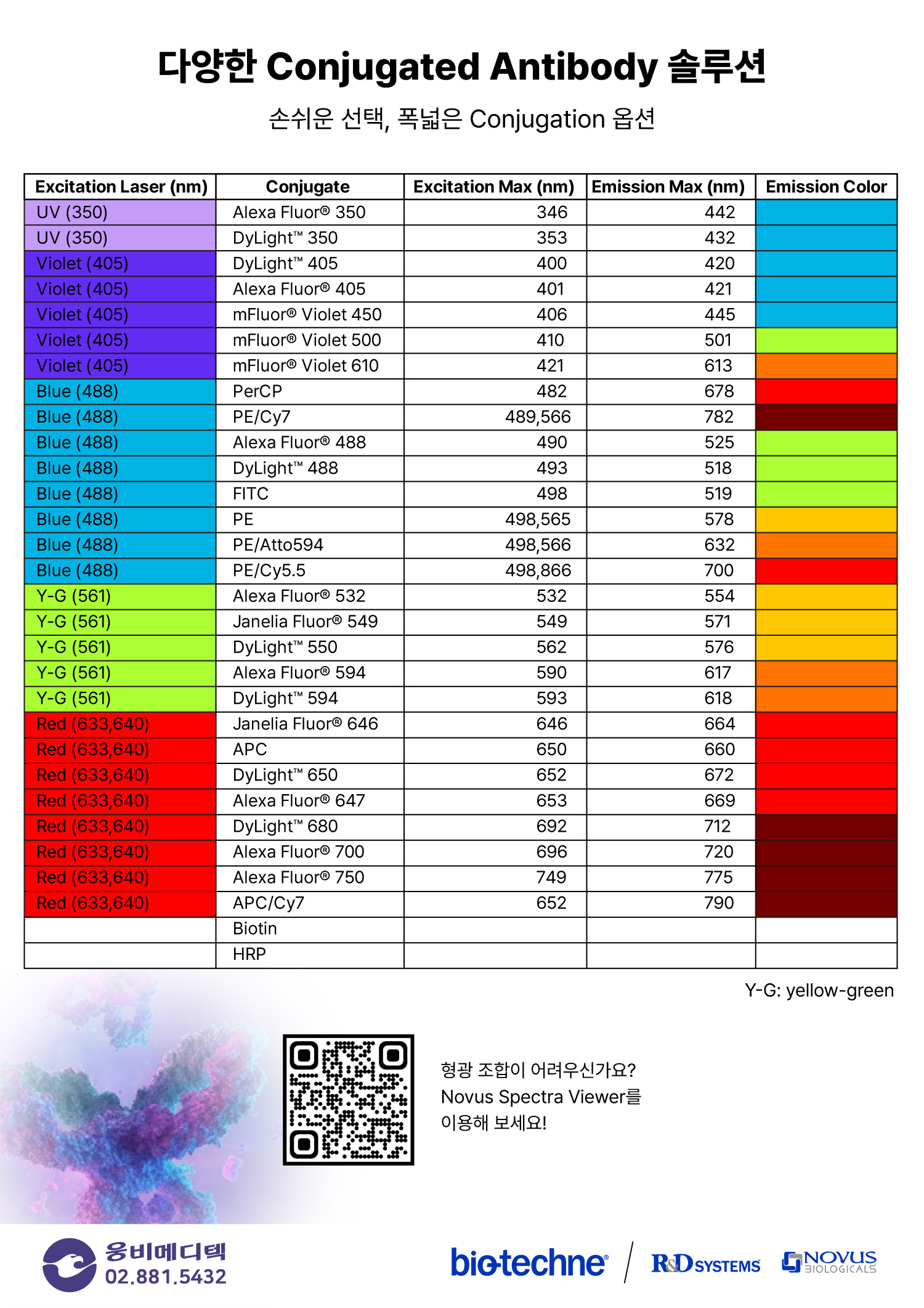 | Excitation Laser (nm) | Conjugate | Excitation Max (nm) | Emission Max (nm) | Emission Color |