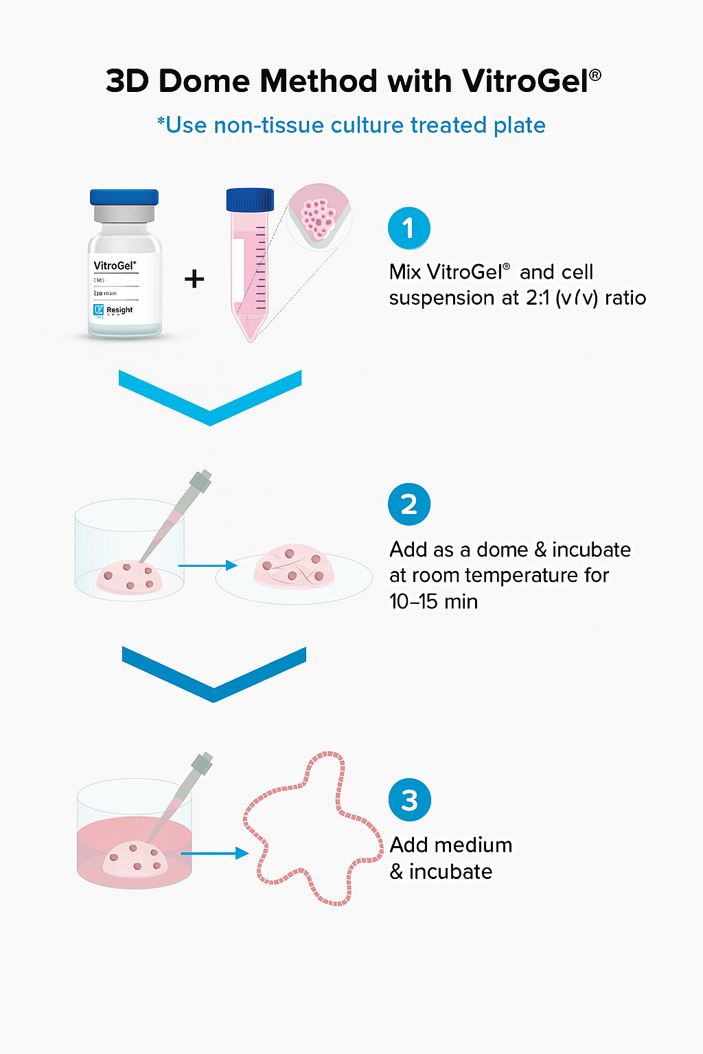 작동 원리: VitroGel Organoid는 세포와 혼합 시 상온에서 자체적으로 3D 하이드로젤 매트릭스를 형성합니다. 이 매트릭스는 세포가 자가 조직화(self-organization)하여 생체 내와 유사한 3D 구조를 형성하고 분화할 수 있는 물리적 지지대와 생화학적 신호를 제공합니다. 특히, VitroGel Organoid는 특정 오가노이드 유형에 맞춰 최적화된 다양한 Matrix를 제공하여(예: Stomach, Lung, Brain, Tumor, Breast) 고객의 연구 목적에 부합하는 환경을 조성할 수 있습니다.